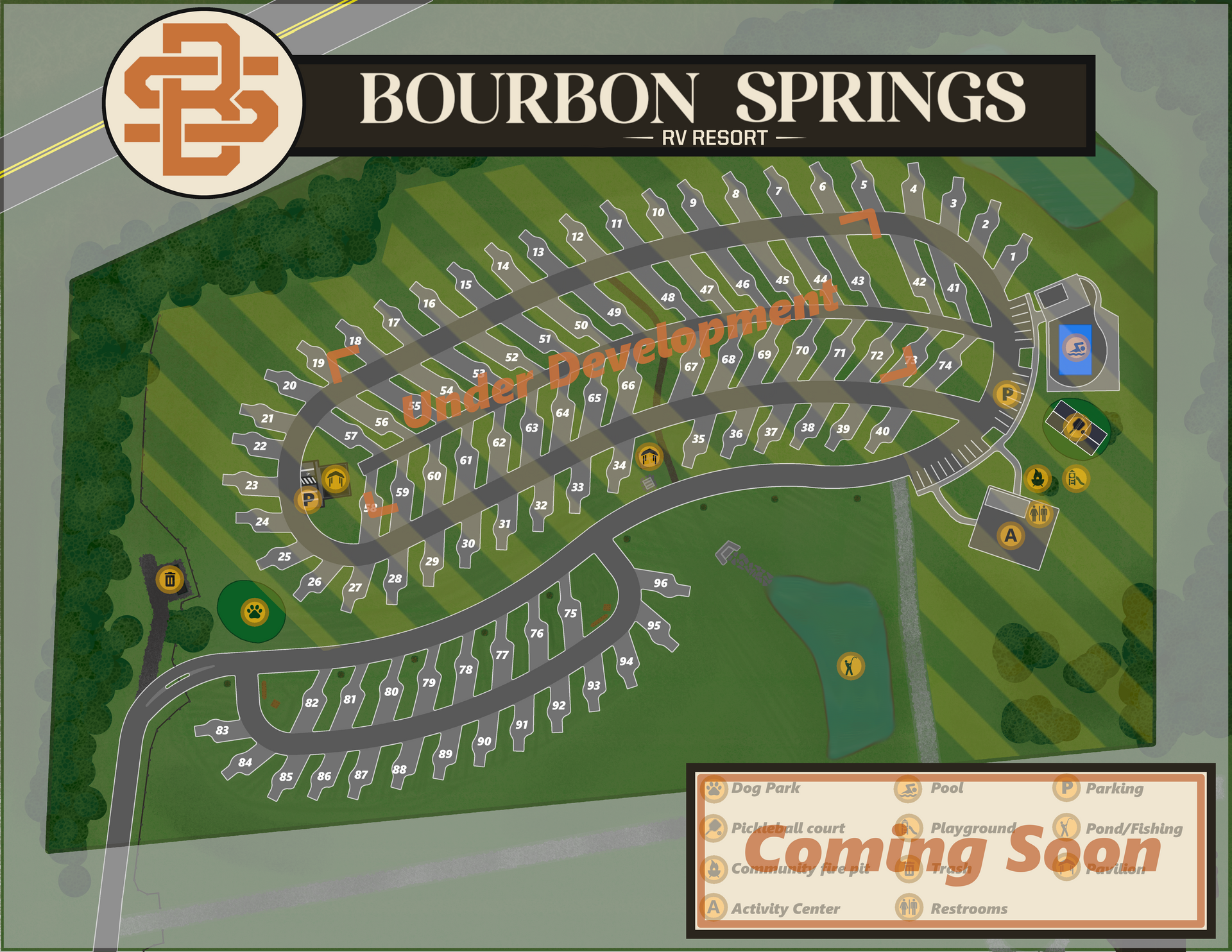 At Bourbon Springs RV Resort, comfort and convenience come standard. All RV sites feature full hookups, Wi-Fi, picnic tables, and fire pits, with generously sized sites and pull-throughs up to 80 feet to easily accommodate large rigs. Guests can enjoy immediate access to our fully stocked catch-and-release pond and spacious new dog park.